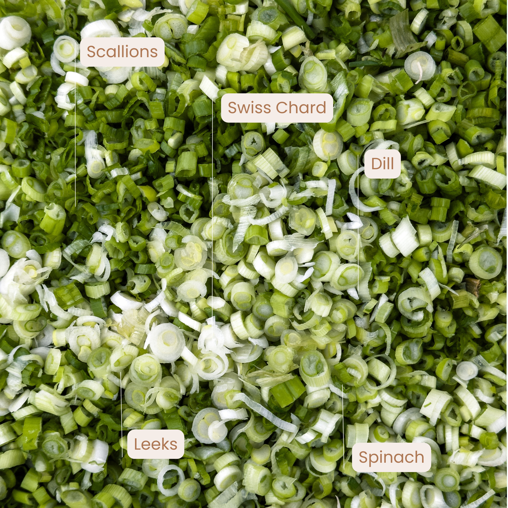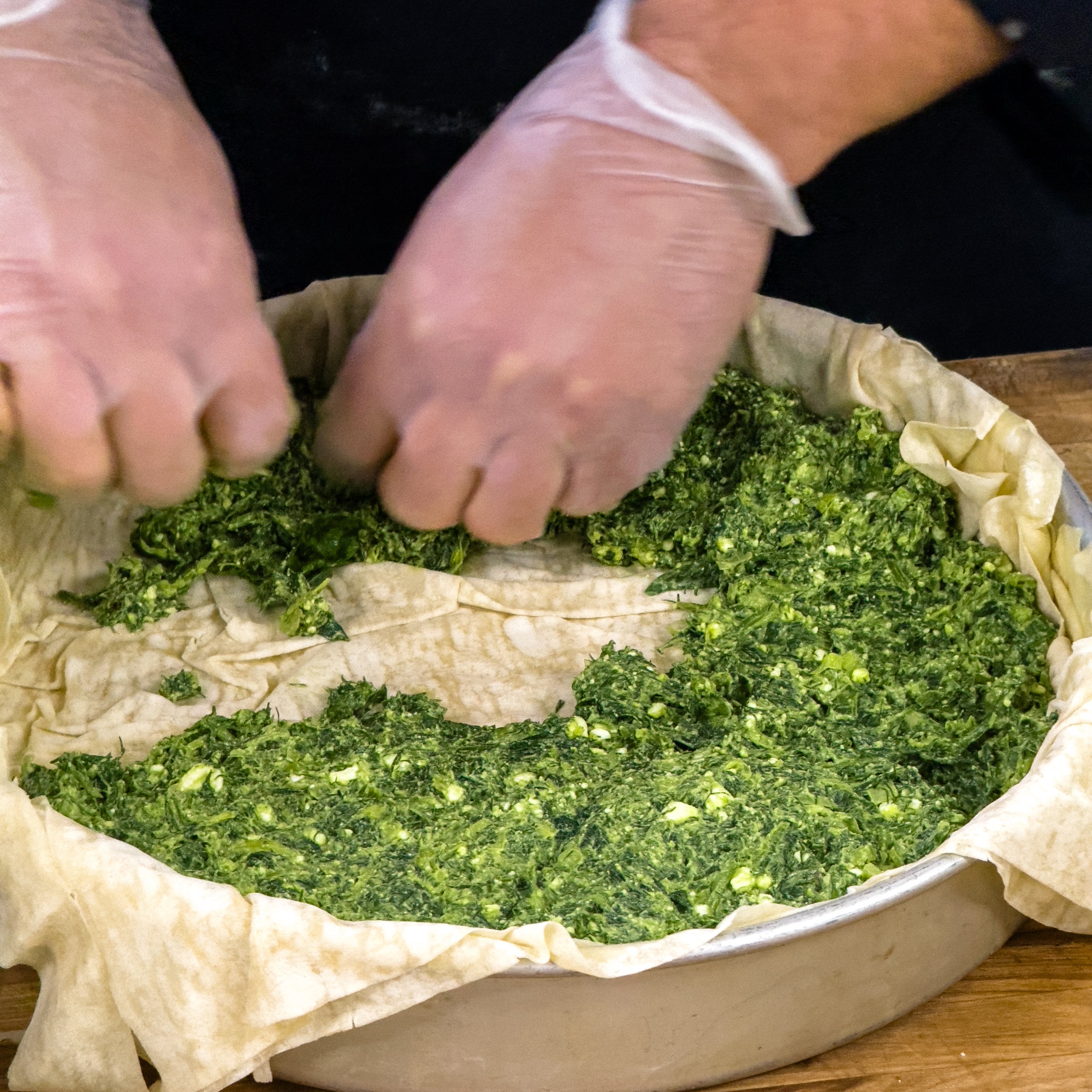 Fresh spinach, Swiss chard, dill, leeks, scallions, feta cheese, handmade phyllo dough (flour, water, olive oil, salt), olive oil, sea salt, black pepper.