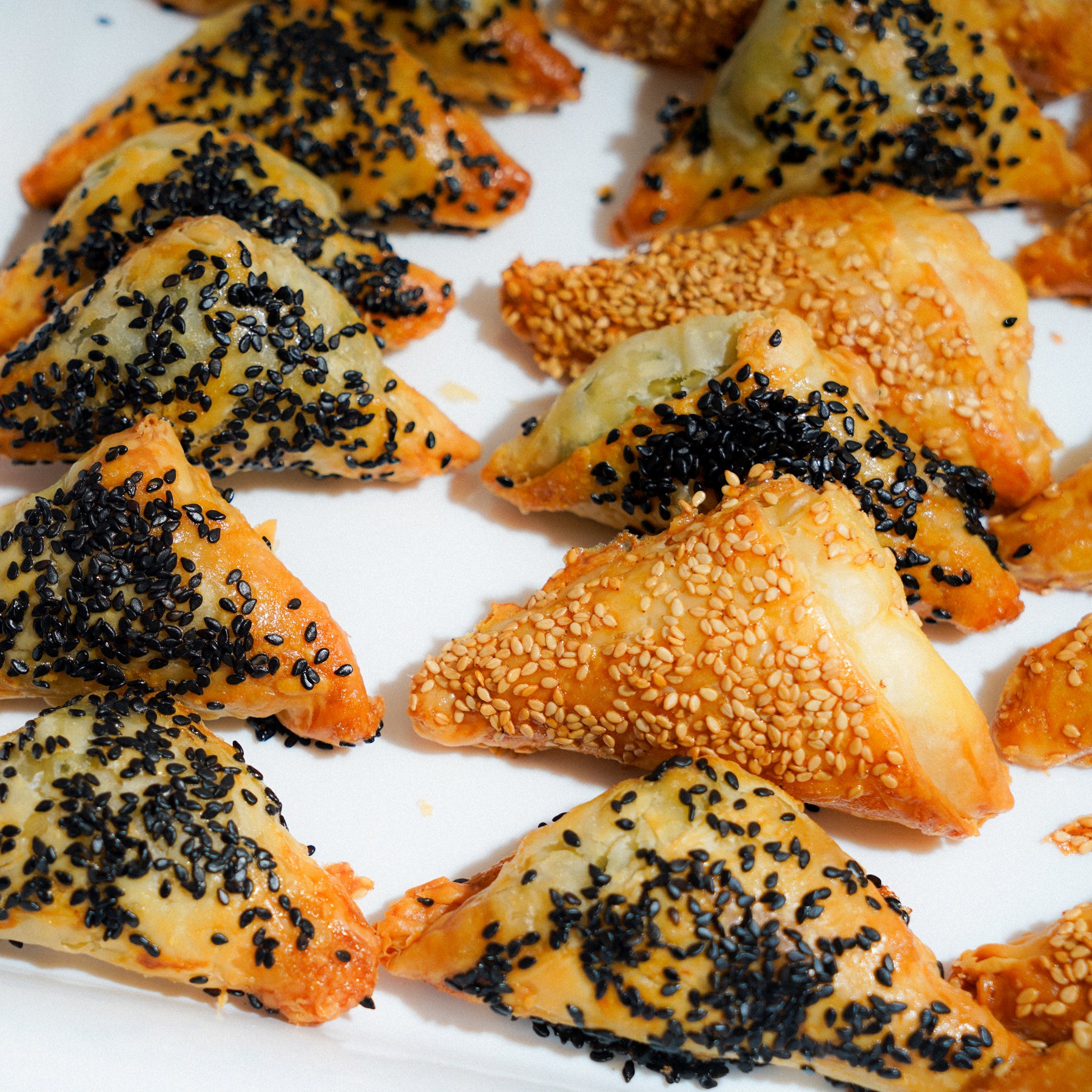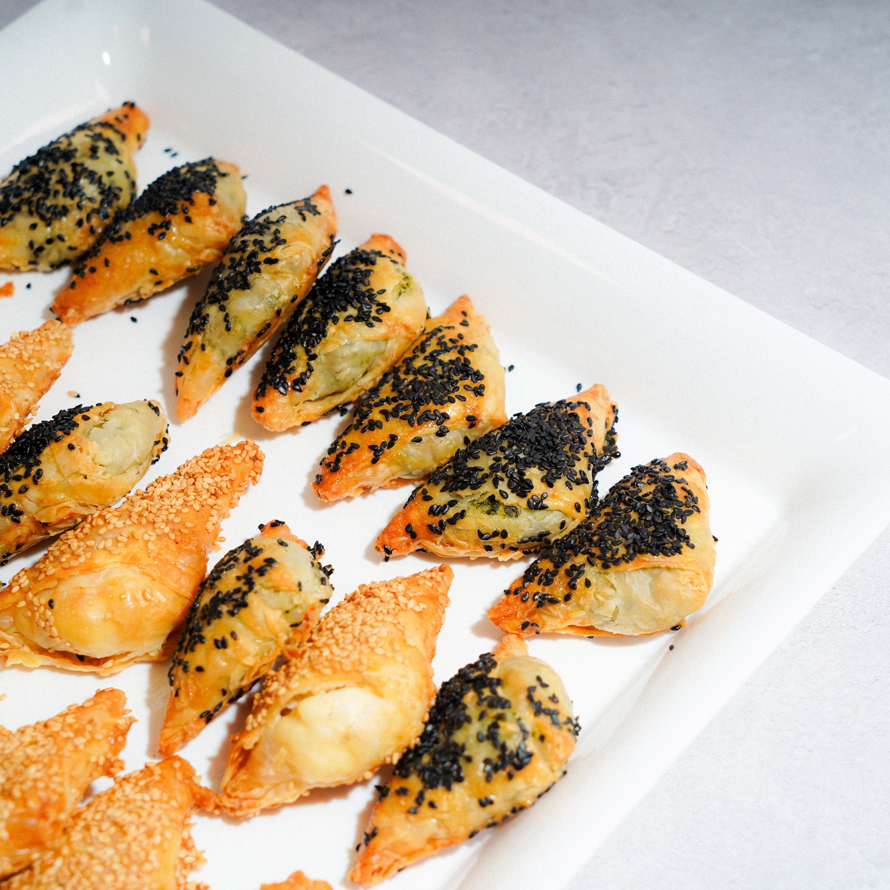 Flaky, golden phyllo pastries filled with a rich blend of spinach, feta, and herbs. Each bite is buttery, crisp, and perfectly savory. Served beautifully arranged on a platter, ready to share. A timeless classic, ideal for any gathering.