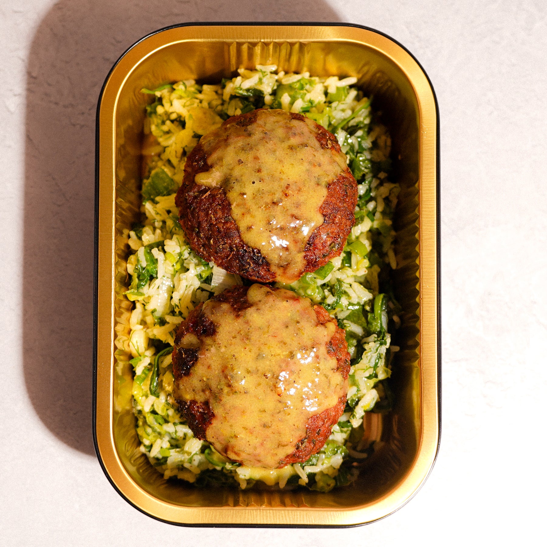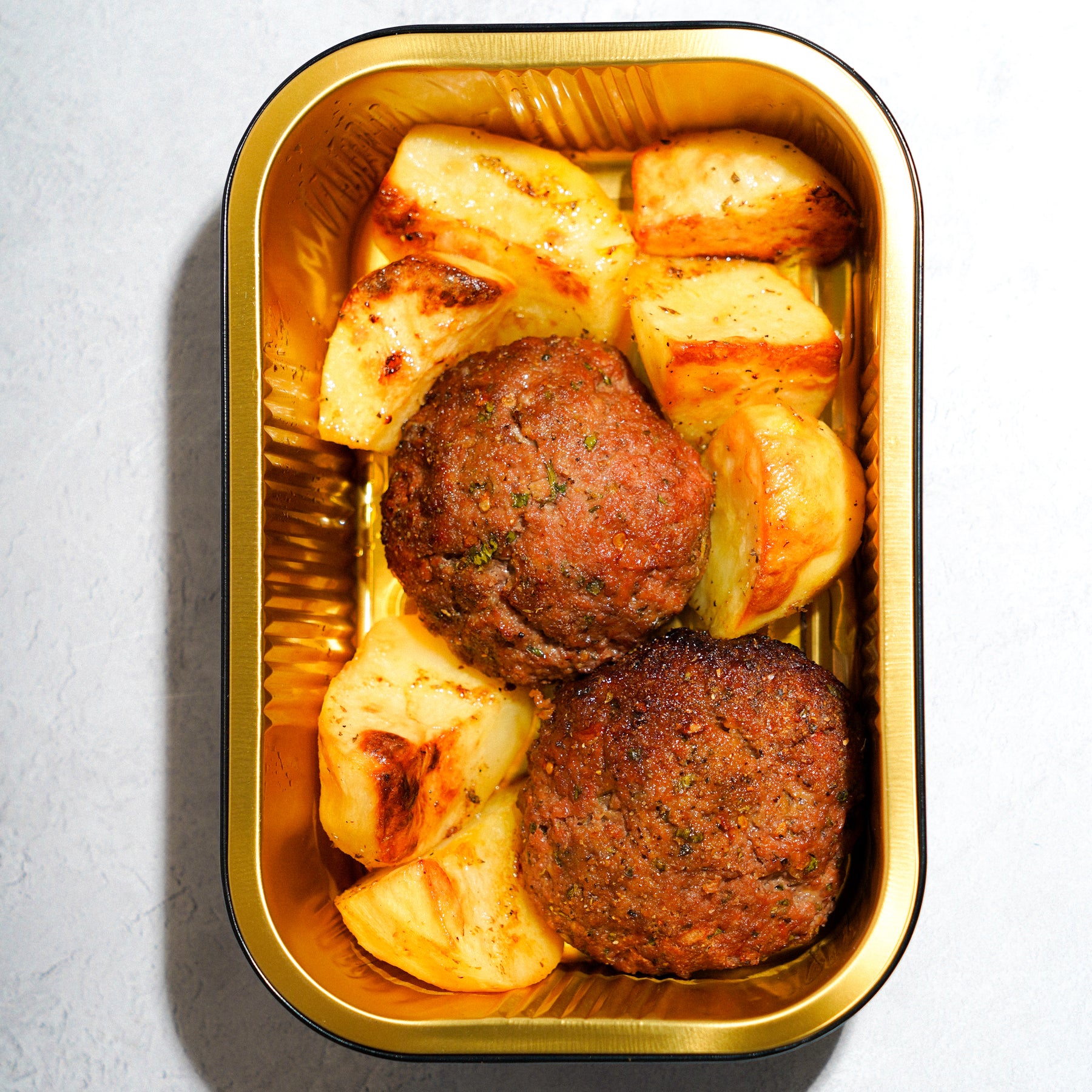 A perfectly portioned meal crafted for balance and flavor. Each serving includes two of our handcrafted biftekia, made with premium grass-fed ground beef, fresh parsley, garlic, onion, and Mediterranean herbs, baked to golden perfection.