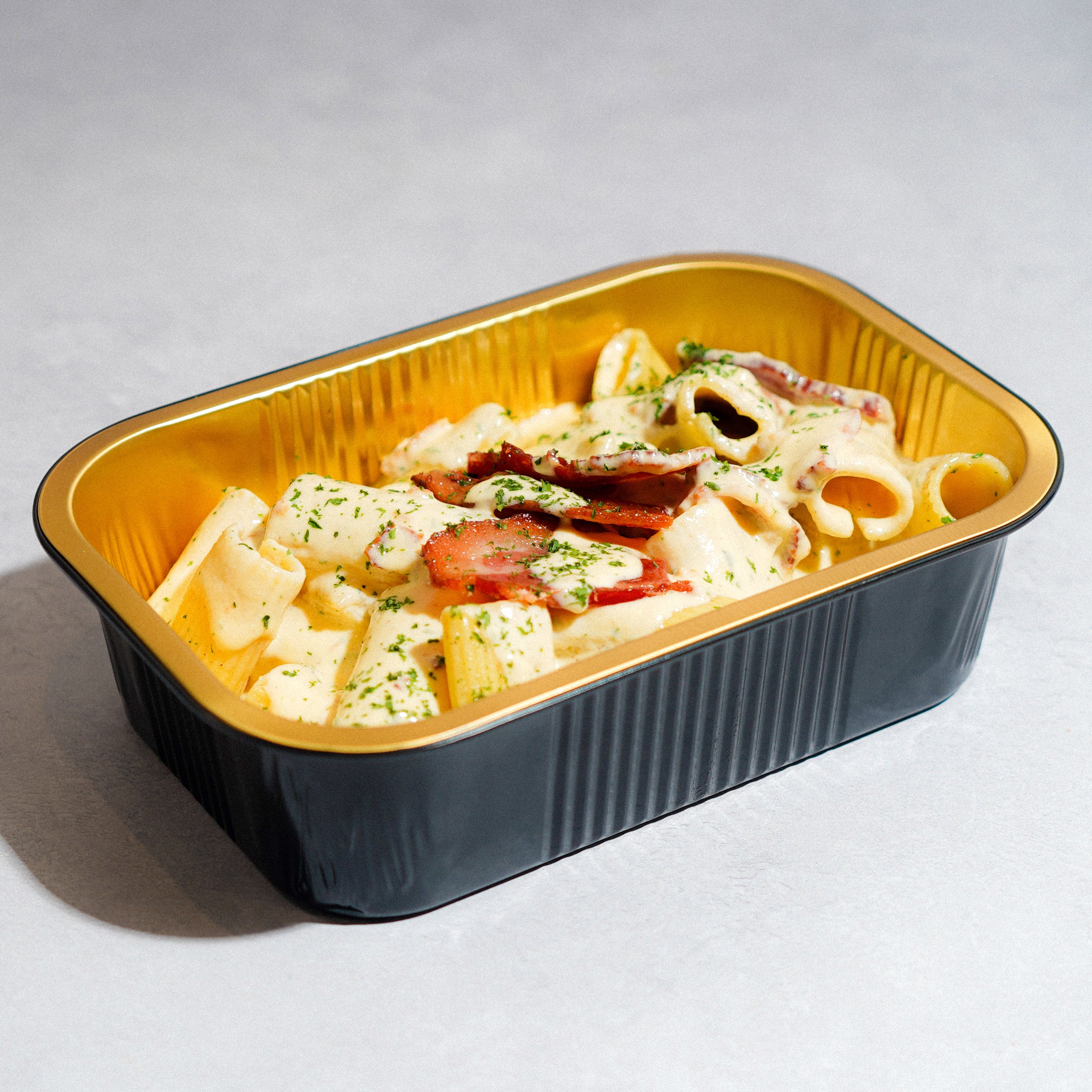 Ingredients: Pasta di Cecill Rigatoni (durum wheat semolina), uncured thick-cut Berkshire bacon, golden egg yolks, aged Pecorino Romano (sheep’s milk cheese), freshly cracked black pepper, hand-torn Italian parsley.