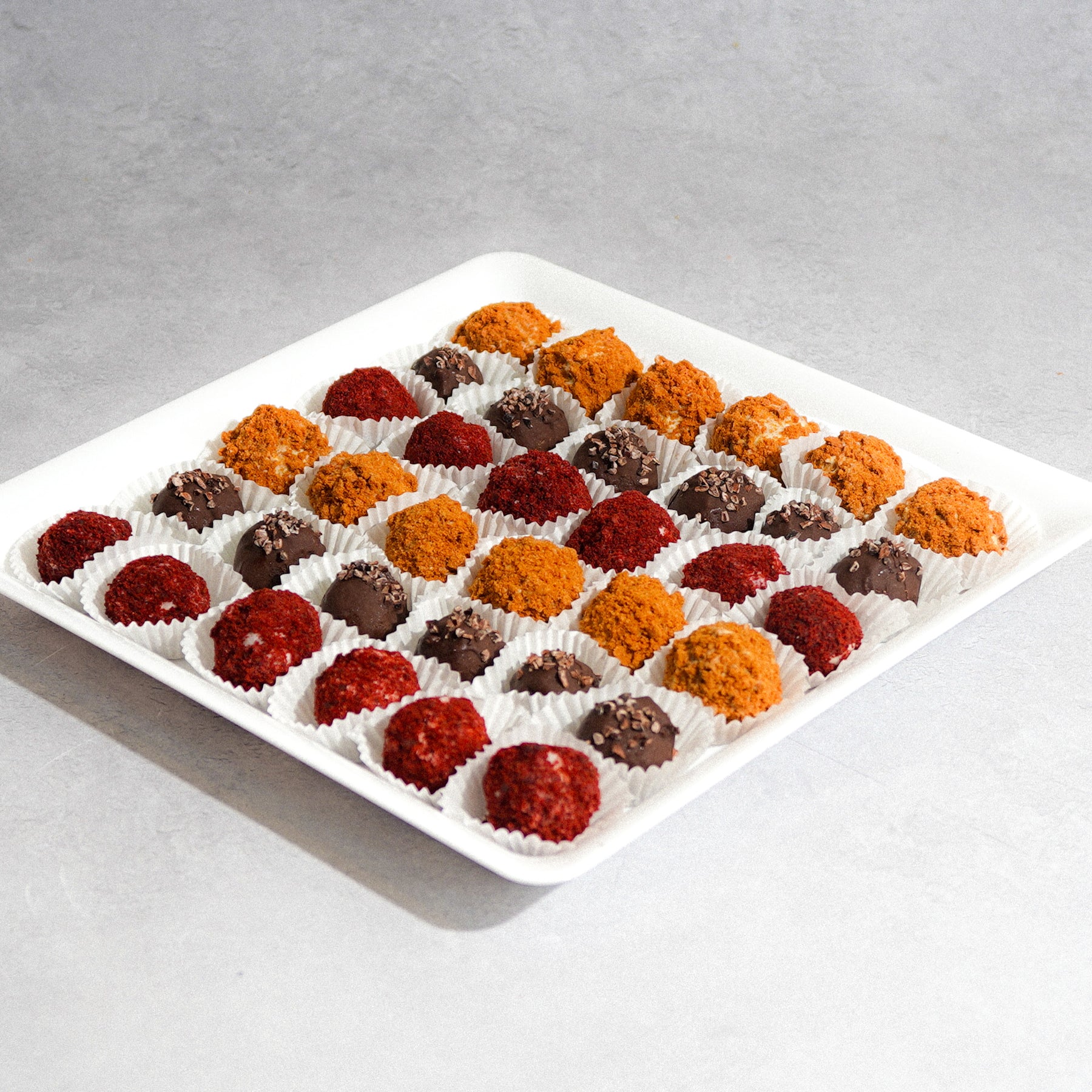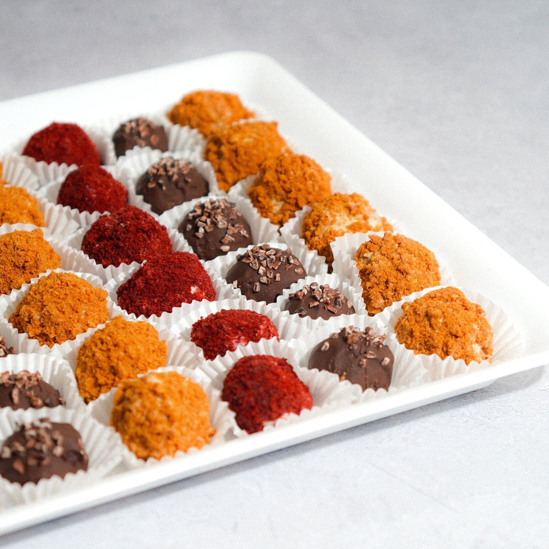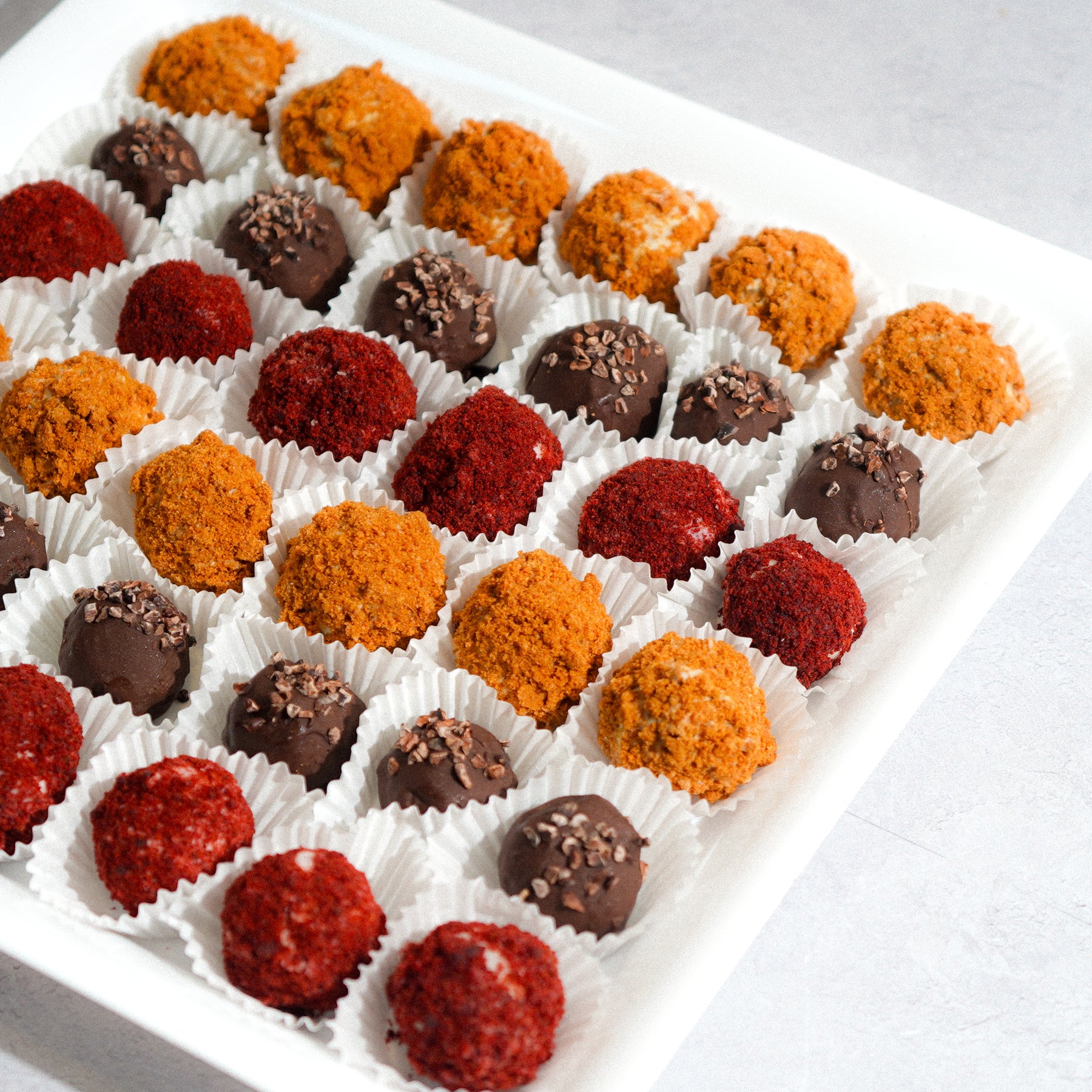 An indulgent trio of handcrafted truffles: Biscoff Cheesecake with a spiced cookie crumble, Red Velvet with a hint of cream cheese frosting, and rich Nutella dipped in dark chocolate and finished with cacao nibs. Perfect for catering—elegant, bite-sized, and impossible to have just one, these luxurious bites combine bold flavor with exquisite presentation to impress your guests.