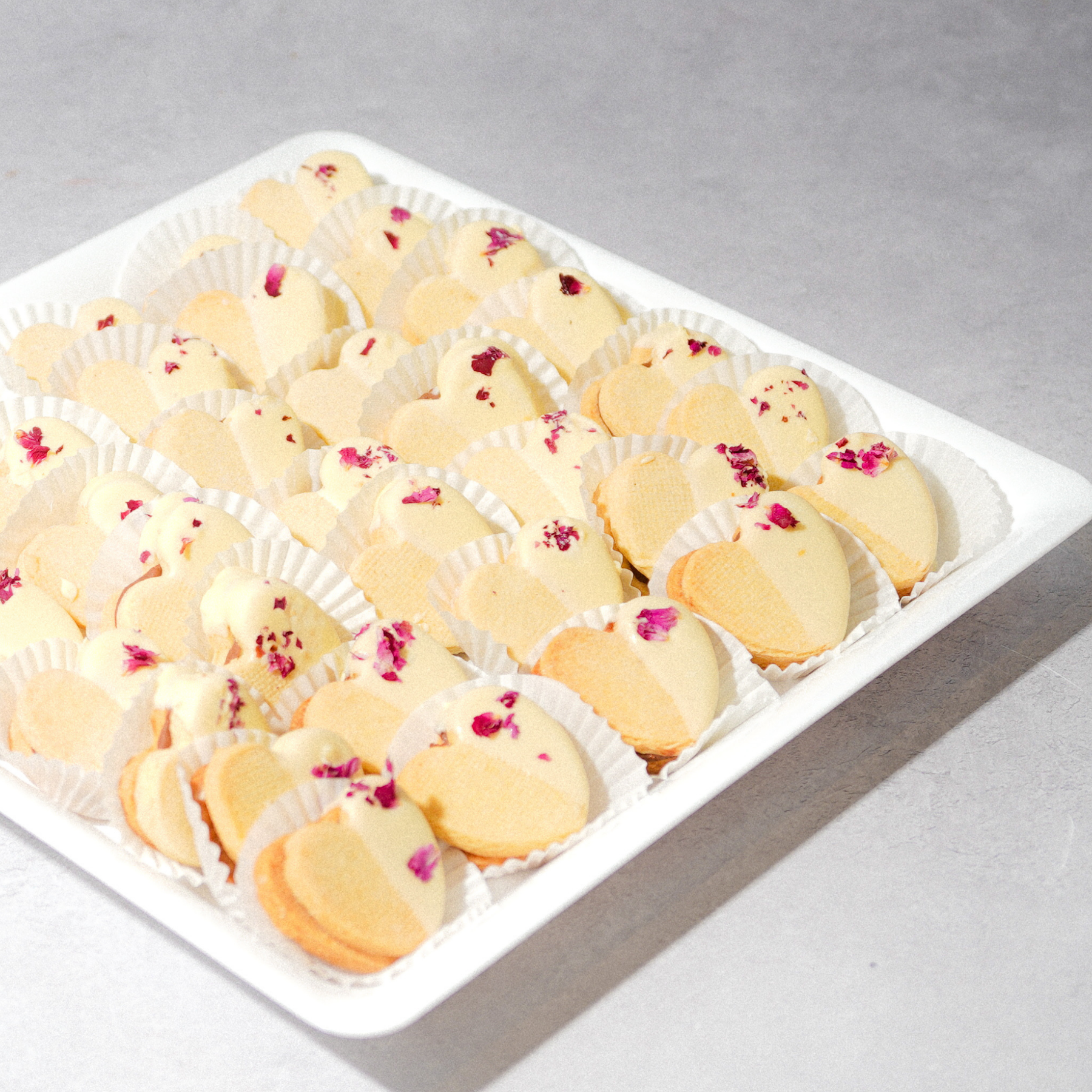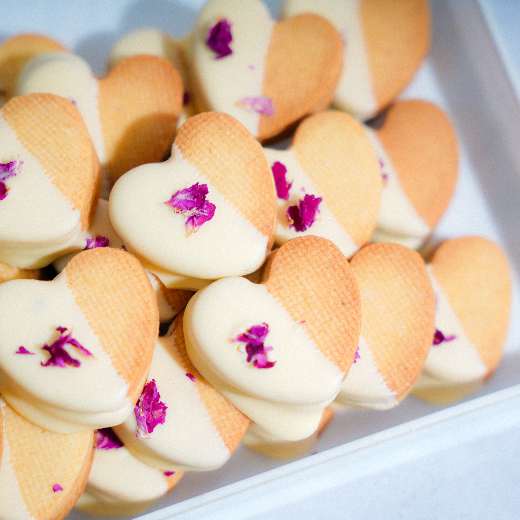 A decadent graham cookie filled with velvety Nutella, enrobed in Belgian white chocolate, and adorned with a crisp wafer and hand-placed edible rose petals. Elegant and refined, these delicate confections are designed for bridal showers, weddings, and unforgettable celebrations.