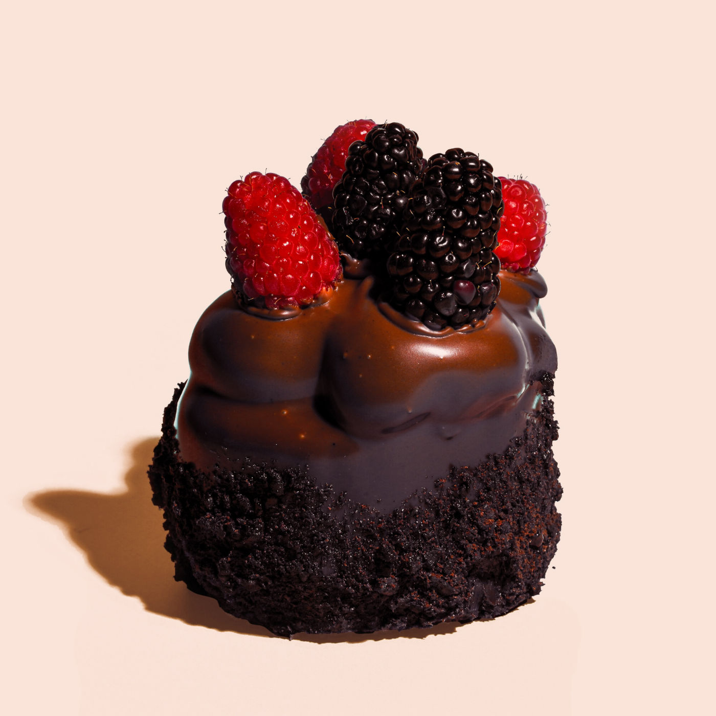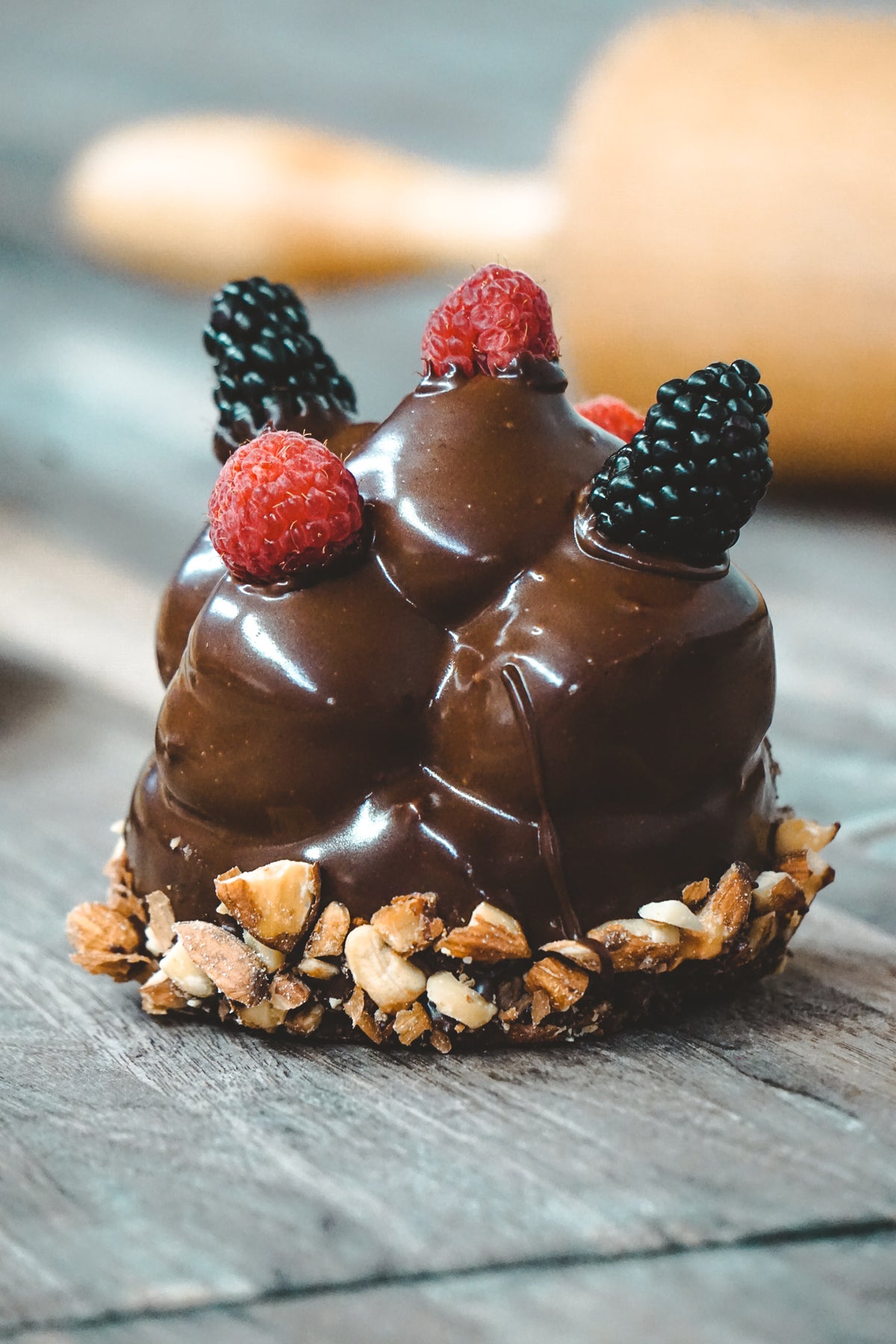 Chopped up greek biscuit, creamy dark chocolate mousse, original style cheesecake covered in Belgium chocolate, topped with fresh berries and coated with nuts.