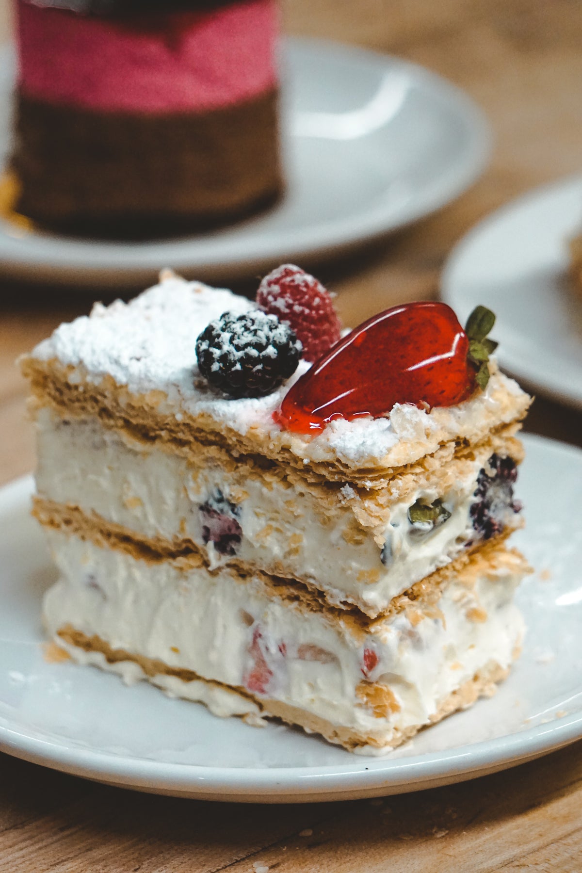 This Fruit Napoleon consists of rich custard filled with fresh berries, layers of mousse & flaky puff pastry cake stacked together and topped with beautiful fresh fruit.Â