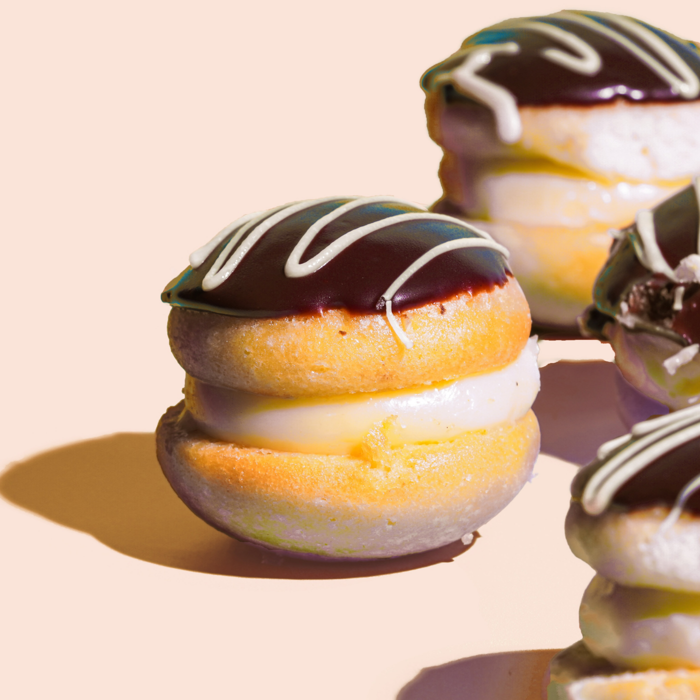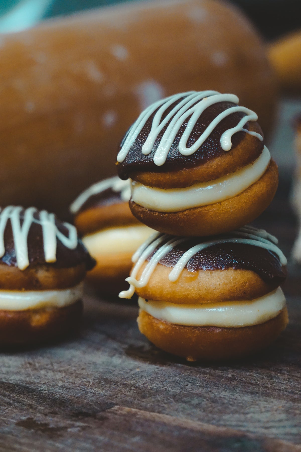 Mini Greek cream puffs with a fabulously rich pastry cream filling & decadent chocolate ganache glaze.