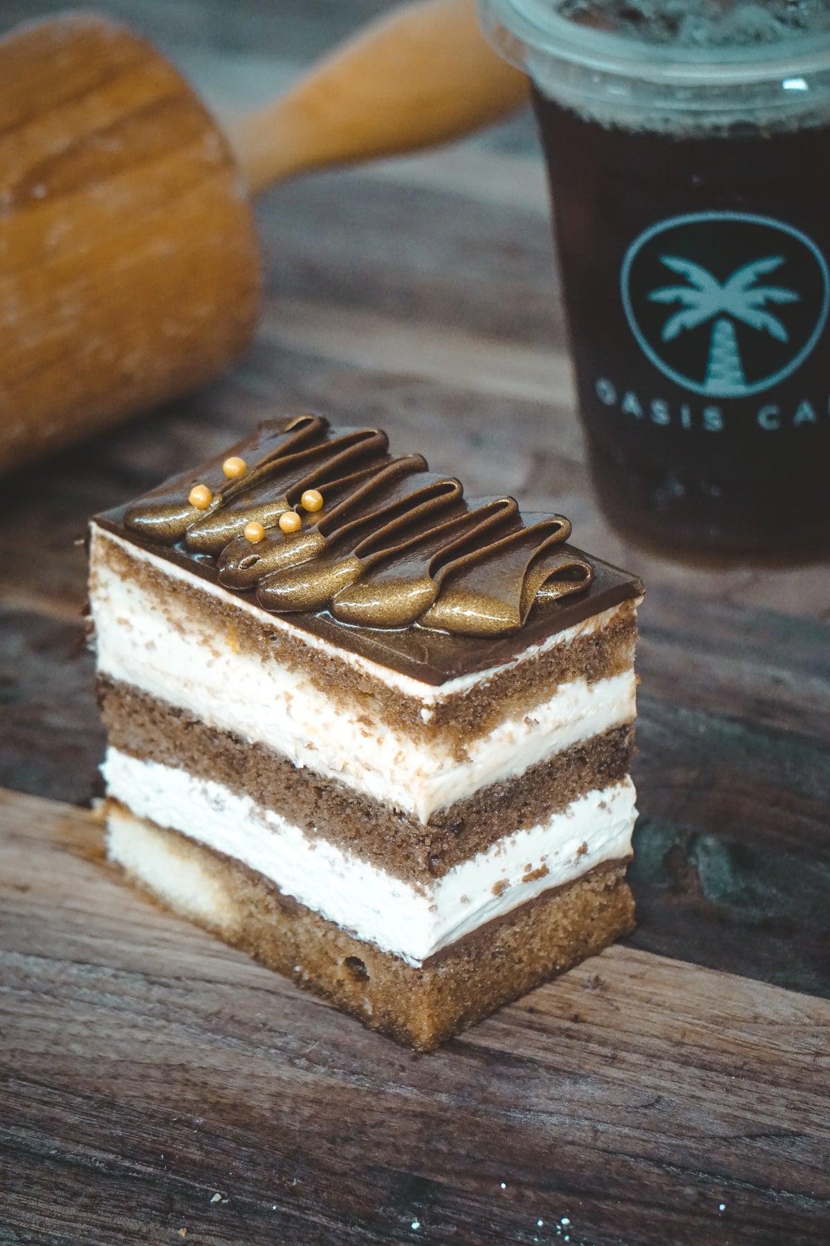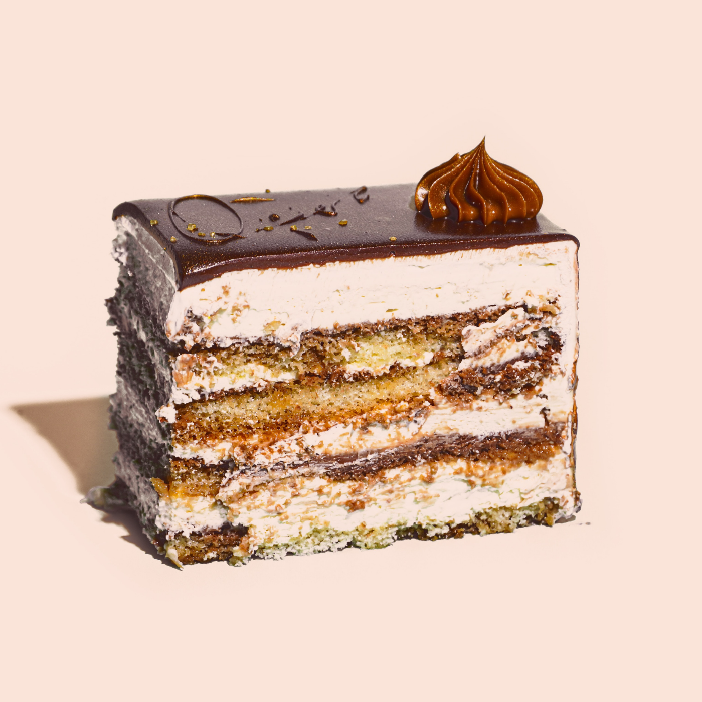 Opera cake is a French cake. It is made with layers of almond sponge cake soaked in coffee syrup, layered with ganache & coffee French buttercream, & covered in a chocolate glaze.