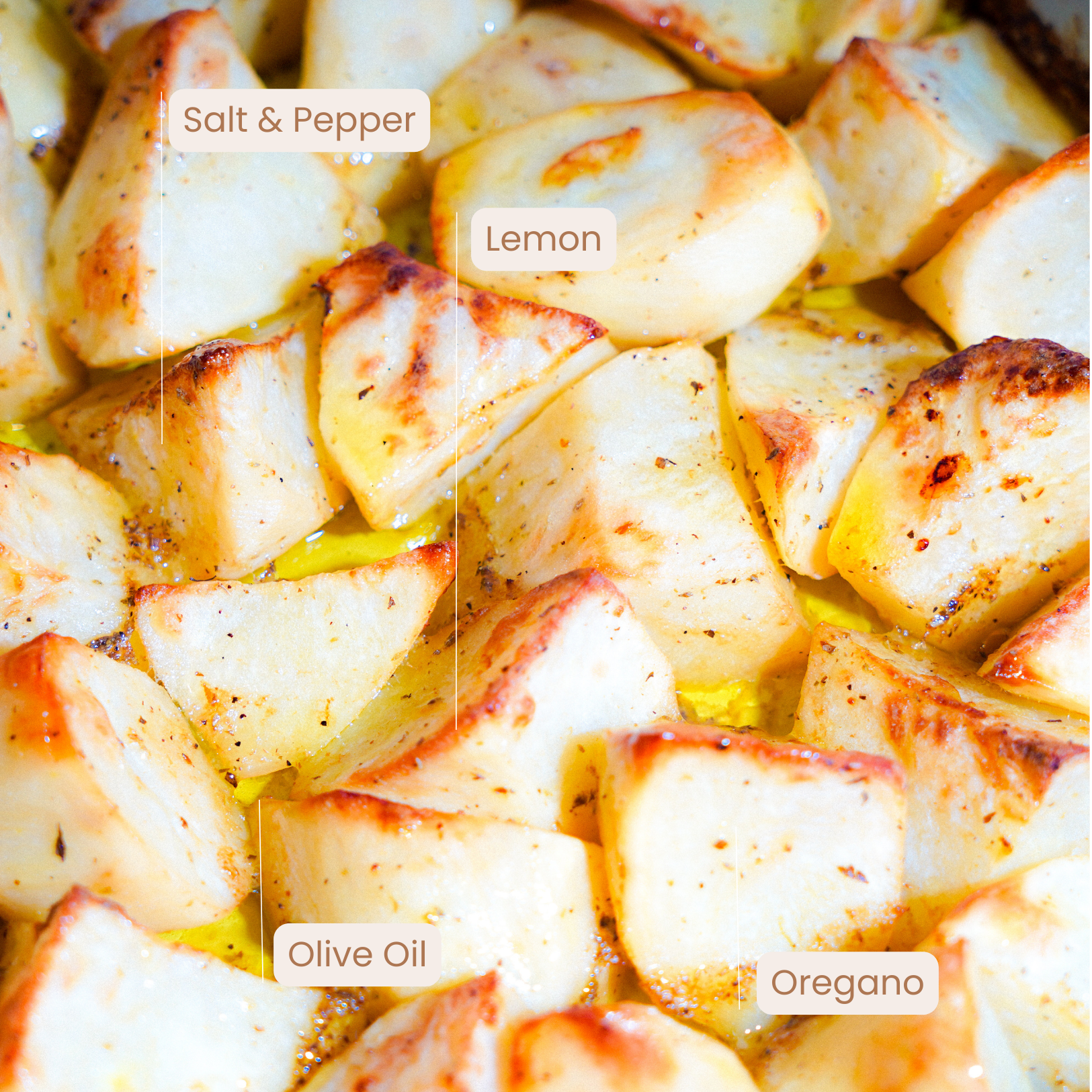 Golden Yukon potatoes, slow-roasted to perfection, infused with the vibrant flavors of freshly squeezed lemon juice, cold-pressed olive oil, and fragrant Mediterranean oregano. Lightly seasoned with pure sea salt and cracked black pepper, each bite delivers a crisp exterior and a creamy, velvety center.